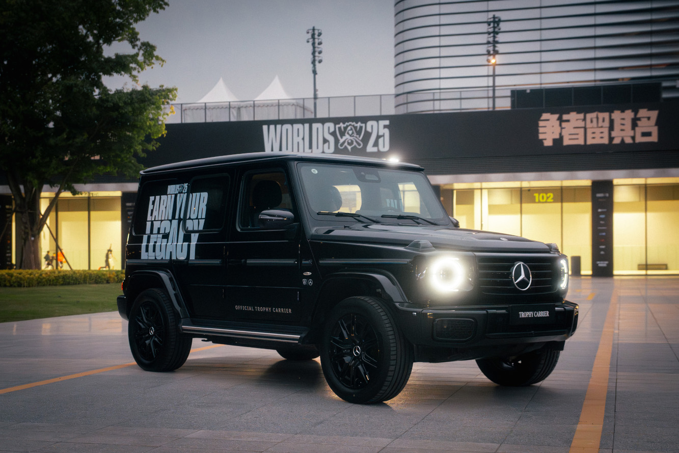 Mercedes-Benz beim League of Legends World Championship (Fotos: Mercedes-Benz)Die Siegertrophäe der League of Legends World Championship wurde in einem gebrandeten Mercedes-Benz zum Finale nach Chengdu gebracht. Die elektrische G-Klasse wurde als offizieller Trophy Carrier mit einem speziell angefertigten Modul im Kofferraum ausgestattet.