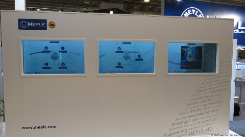 Für den Messestand-Sonderbau der Wulf Gaertner Autoparts AG wurden die transparenten LCD Panels mit Sicherheitsglas und einem Multitouchrahmen verbaut. Mittels Touchfunktion auf den Scheiben hatten die Messebesucher die Möglichkeit, auf virtuelle Meyle-Entdeckungstour zu gehen und sich detailliert über die Marke zu informieren. Die Besonderheit der hierfür benötigten LCD Panels lag darin, dass sie bei einem weißen Präsentationshintergrund quasi transparent wie Glasscheiben werden und der Betrachter durch diese Panels hindurch auf die Inhalte in der Box sehen kann. Zudem lassen sich dabei, wie auf einem normalen LCD Monitor, Bildinhalte auf den Scheiben darstellen.