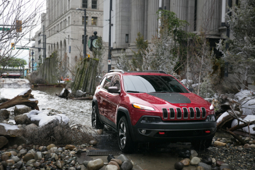 Zu diesem Zweck hatte Jeep die Granville Street in Vancouvers City gesperrt und mit Wasser, versteckten Pumpen, Schnee sowie Fisch-Eis, 80 Bäumen, Moos, Holzblöcken und zahmen Wölfen in eine Bergfluss-Landschaft verwandelt.