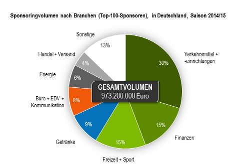 Die 100 größten Sportsponsoren zahlen jährlich insgesamt 973 Millionen Euro und damit 15 Prozent mehr als im Jahr 2012. Unternehmen aus den Bereichen Verkehrsmittel und -einrichtungen, zu denen die großen Automobilhersteller, Fluggesellschaften und die Deutsche Bahn zählen, haben mit 30 Prozent den stärksten Anteil am Sponsoringvolumen. Dahinter folgen mit je 15 Prozent die Branchen Finanzen sowie Freizeit und Sport.