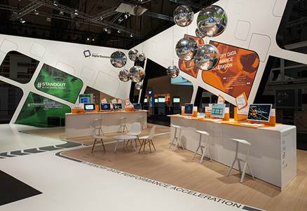 Die Formensprache des Standdesigns leitete sich dabei von dem Icon der „Digital Business Plattform“ ab, das auch die umlaufende Fassade mit großzügigen Fenstern und Öffnungen zu den Messegängen aufgriff und damit eine einladende Markenarchitektur schuf. Herzstück des Campus war der „Partner Park“, in dem mit Showcases die Kernthemen visualisiert wurden. Dahinter setzte das „Digital Gate“ mit großformatiger Medienbespielung eine emotionale Untermalung für den gesamten Ausstellungsraum.